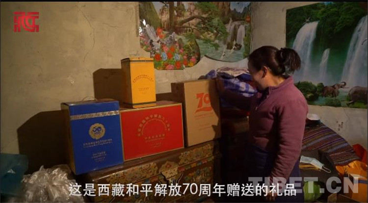 “新春走基層”采訪組一行在藏族群眾查斯家入戶采訪時(shí),驚喜地發(fā)現(xiàn)家中完好整齊地陳列著中央代表團(tuán)贈(zèng)送的西藏自治區(qū)成立50周年、西藏和平解放60周年、70周年紀(jì)念品禮盒