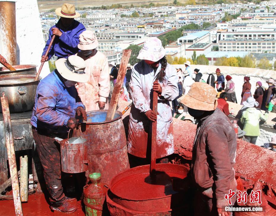 布達拉宮管理處維修科工作人員熬制粉刷涂料。中新社記者 趙延 攝