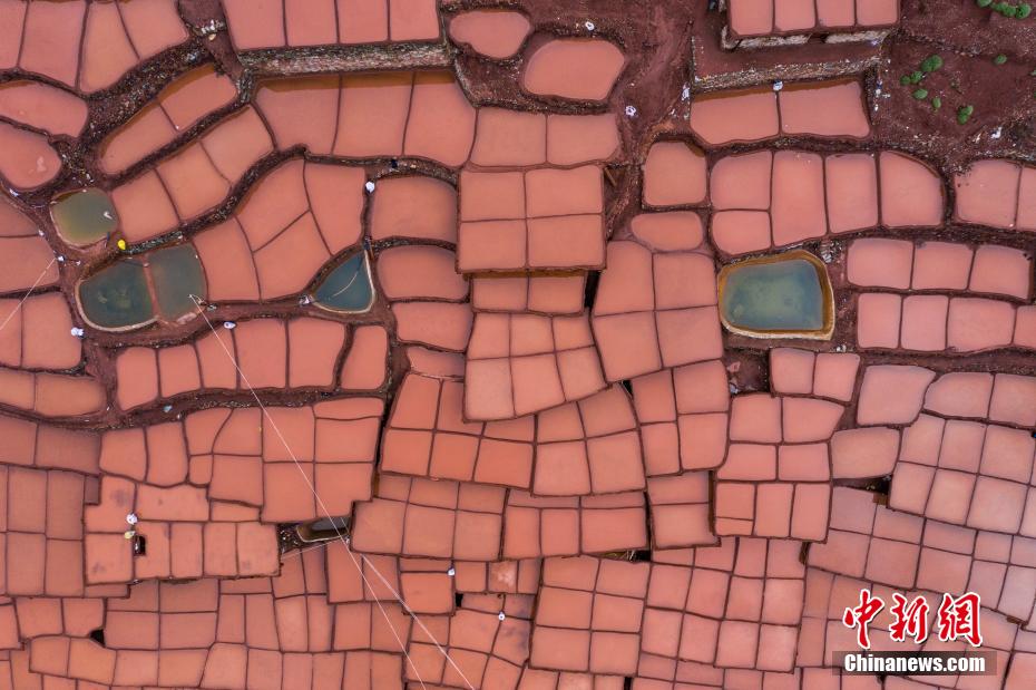 當?shù)孛癖娫跒憸娼祥_山鑿井,取出巖層深處含鹽的鹵水倒入鹽田,經(jīng)陽光蒸曬、風干,結晶成鹽。何蓬磊 攝