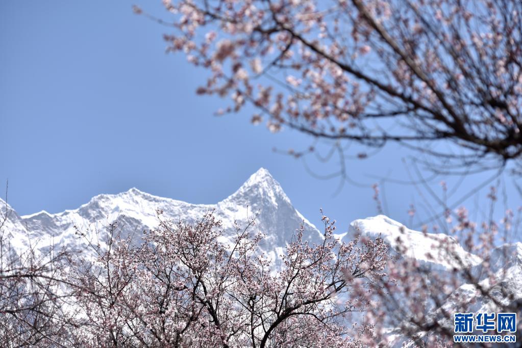 3月28日在西藏林芝市索松村拍攝的桃花和南迦巴瓦峰。新華社記者 孫瑞博 攝