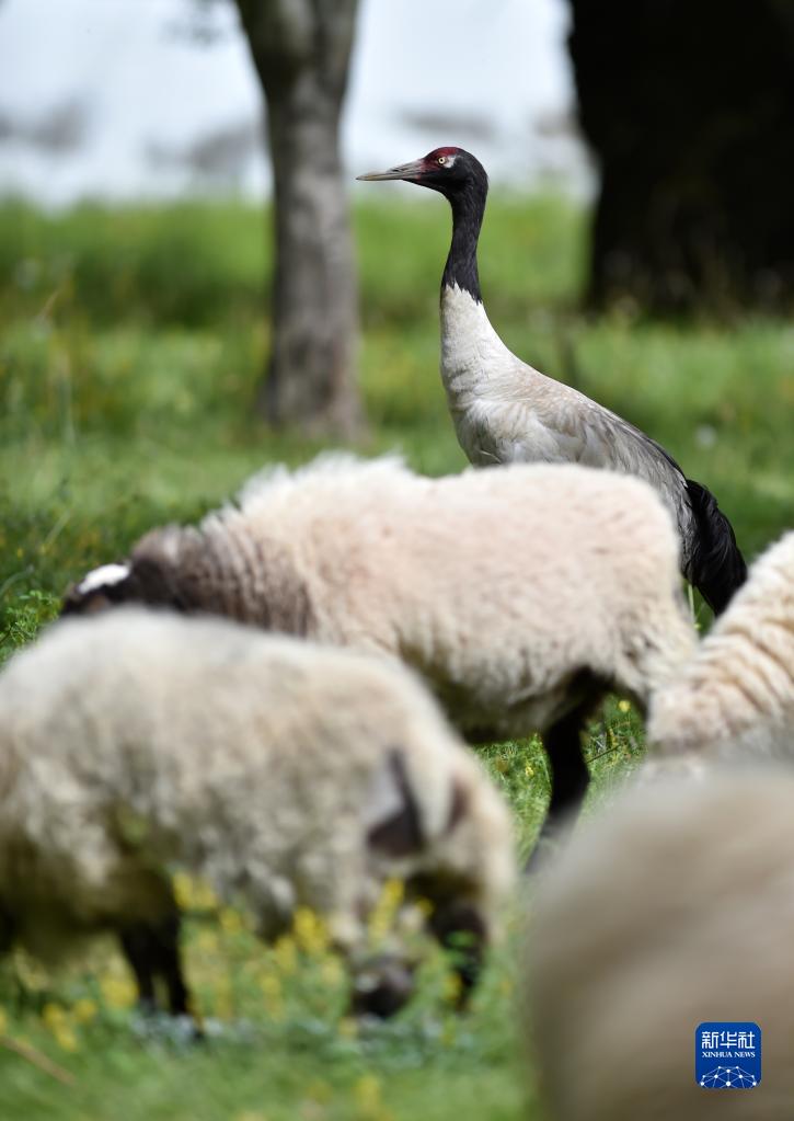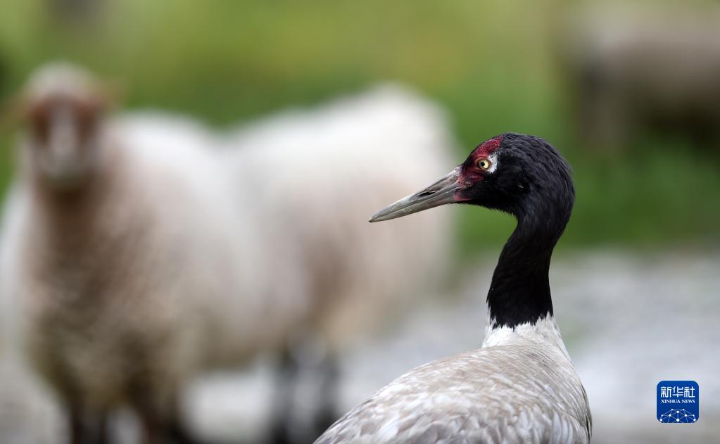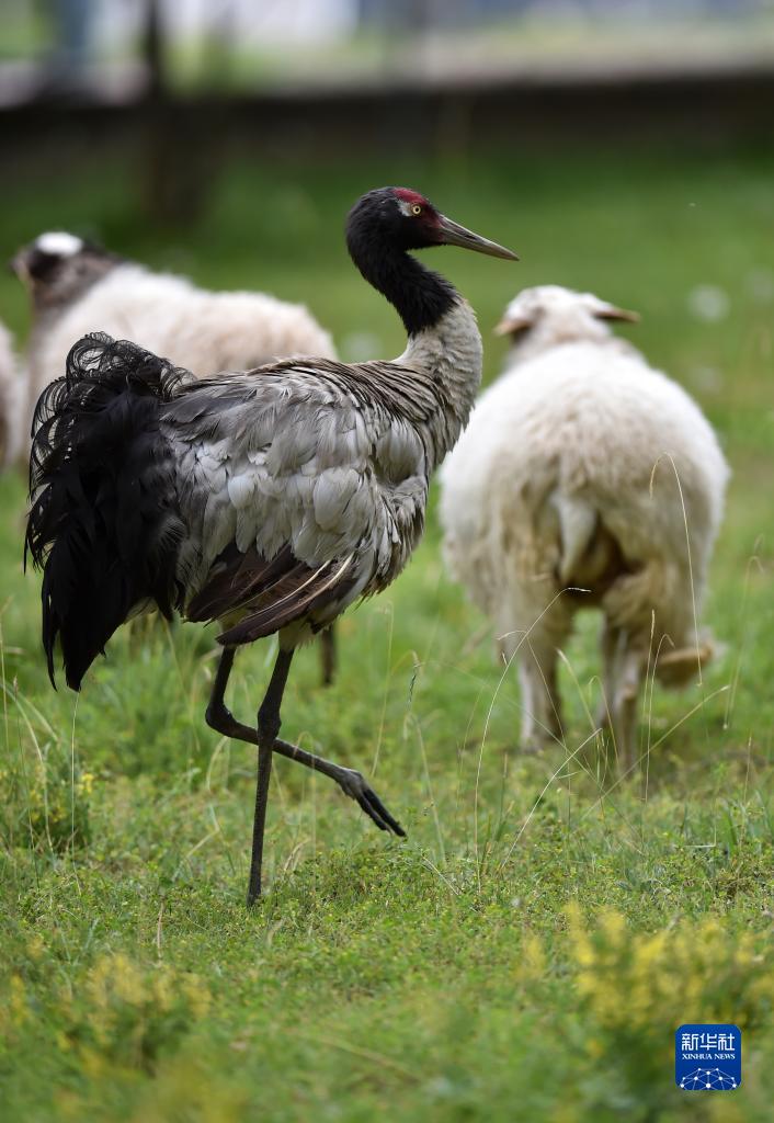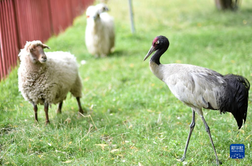 9月8日,黑頸鶴站在羊群中。新華社記者 覺(jué)果 攝