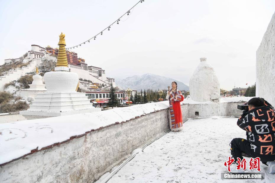 2月21日,游客穿著藏族傳統(tǒng)服飾在布達(dá)拉宮拍照留念。當(dāng)日,西藏拉薩市迎來(lái)降雪,雪后的拉薩城區(qū)和周?chē)荷桨籽┌}皚,風(fēng)景如畫(huà)。 中新社記者 貢嘎來(lái)松 攝