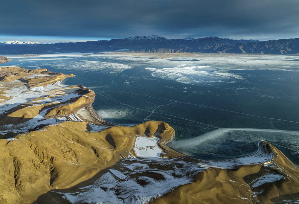 阿里日土縣境內(nèi)航拍拍攝冬季班公湖。