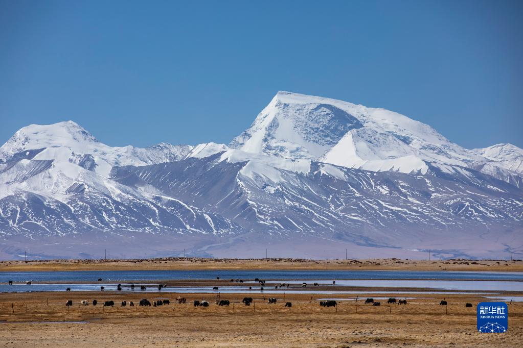 4月22日,牦牛在西藏阿里地區(qū)普蘭縣境內(nèi)納木那尼峰山腳下活動(dòng)。新華社發(fā)(劉曉東攝)