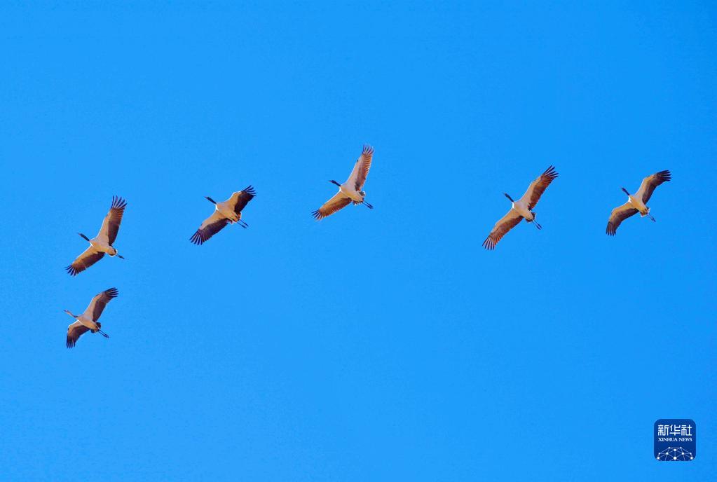 黑頸鶴群飛過(guò)林周縣強(qiáng)嘎鄉(xiāng)境內(nèi)山梁(11月6日攝)。新華社記者 姜帆 攝