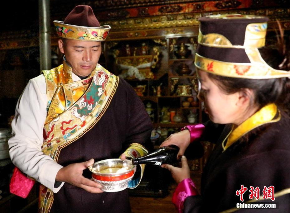 11月24日恰逢藏歷十月初一,西藏林芝迎來2023年工布新年,這是西藏最早的新年。工布新年以其悠久的歷史、鮮明的特色、豐富的內涵,于2006年被列入第一批西藏自治區(qū)非物質文化遺產(chǎn)保護名錄。圖為村民向客人敬酒。 阿仁 攝