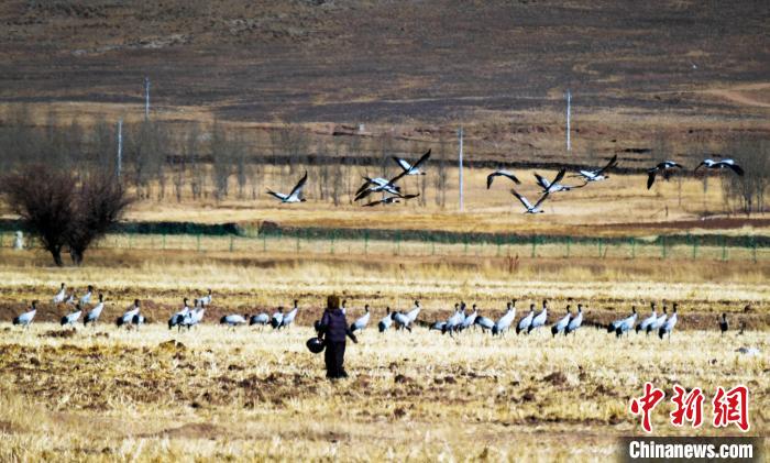 近日,大批黑頸鶴飛臨西藏自治區(qū)拉薩市林周縣越冬。黑頸鶴是國家一級(jí)保護(hù)動(dòng)物。近年來,隨著當(dāng)?shù)厣鷳B(tài)保護(hù)力度越來越大,每年11月前后至次年3月底,來林周縣越冬的候鳥越來越多。