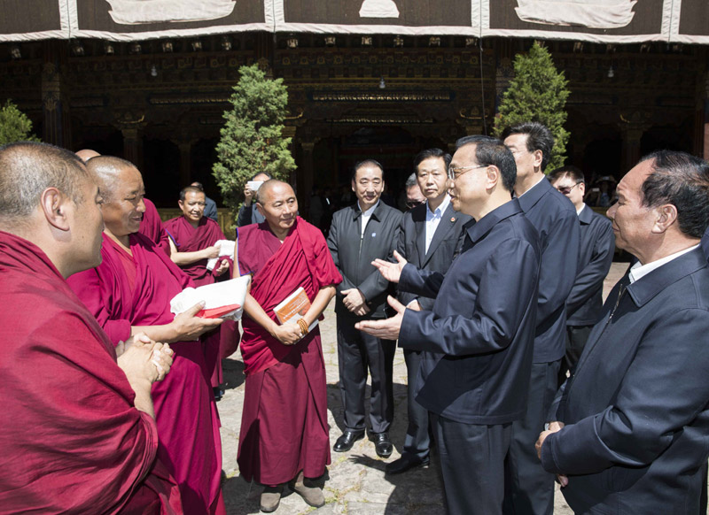 7月26日下午,李克強(qiáng)總理來到拉薩市大昭寺看望慰問西藏宗教界人士。始建于653年的大昭寺是西藏現(xiàn)存最輝煌的吐蕃時期寺廟建筑。李克強(qiáng)向西藏廣大宗教界人士致以誠摯的問候和衷心的祝福。他說,大昭寺是藏傳佛教的圣殿,同時見證了漢藏和親、民族團(tuán)結(jié)的光輝歷史。希望西藏廣大宗教界愛國人士要以歷輩高僧大德為榜樣,為維護(hù)祖國統(tǒng)一、民族團(tuán)結(jié)、社會和諧作出有益貢獻(xiàn),促進(jìn)宗教和睦、佛事和順、寺廟和諧。祝愿大家精修得道、身體健康、扎西德勒!