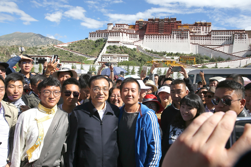 7月27日,考察布達(dá)拉宮文物保護(hù)之后,李克強(qiáng)總理來到布達(dá)拉宮廣場??吹娇偫淼絹?,廣場上的市民與游客潮涌而來,爭相與總理握手。李克強(qiáng)說,從你們的笑容中和精神面貌上我能感受到這里的氣氛祥和安寧,衷心祝愿大家生活安康,扎西德勒!有游客高聲喊,“總理能不能和我們一起照張相?”李克強(qiáng)欣然應(yīng)允。市民游客們紛紛拿出各自的手機(jī),有的自拍,有的交換手機(jī)相互幫著拍,密集的拍攝聲此起彼伏。