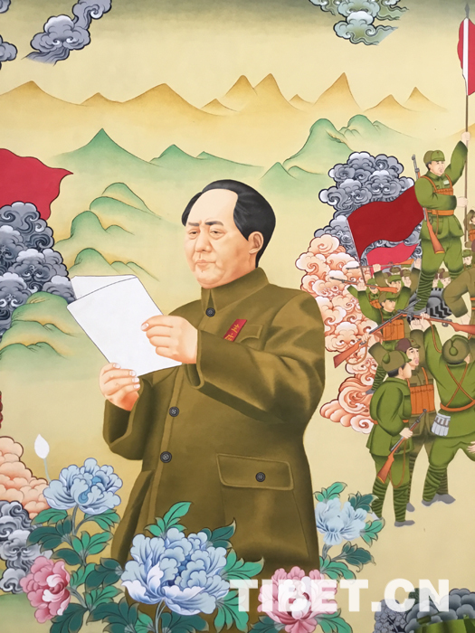 中國(guó)西藏網(wǎng)訊 據(jù)悉,由“華銳唐卡藝術(shù)傳習(xí)所”唐卡代表性傳承人扎西多杰設(shè)計(jì)創(chuàng)作的紅色文化唐卡《世界偉人——毛澤東》即將完工,將在2019年問世。