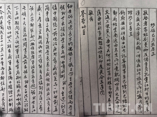 1929年(民國十八年)8月1日,劉曼卿一行從上海出發(fā),開始為期近一年的西藏之行。行至芒康時,劉曼卿寄給其妹劉曼云(藏文名為:巴月照)一封漢藏文合并的字跡潦草的文稿,并囑咐她整理抄正后轉(zhuǎn)呈國民政府。此封文稿是劉曼卿行至江卡,就是現(xiàn)在的芒康地方時擬就的,記述了劉曼卿一行到該地后沿途的經(jīng)過情形。因為當(dāng)時的通信很不便利,劉曼卿托芒康的客商將這封信帶到巴塘,又由巴塘的郵局經(jīng)云南發(fā)往南京。輾轉(zhuǎn)四個月之久,這封信才寄到劉曼云手中,而此時已是民國十九年的3月份了。