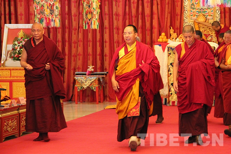 圖為土多申格副院長(zhǎng)帶領(lǐng)經(jīng)師代表和學(xué)員代表,虔誠(chéng)地向十一世班禪敬獻(xiàn)曼扎、佛像、佛塔、佛經(jīng)。攝影:孫健