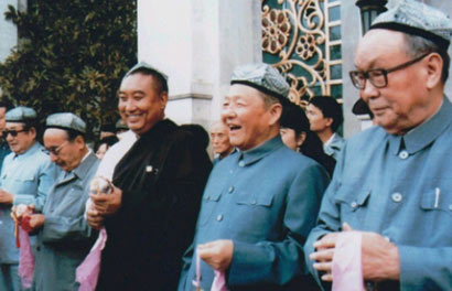 圖為習(xí)仲勛(右二)與烏蘭夫(右一)、十世班禪(右三)、賽福鼎?艾則孜(右四)、楊靜仁(右五)在北京民族文化宮。圖片來源:《中國(guó)西藏》雜志