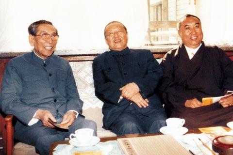 圖為1986年4月,習(xí)仲勛(中)與十世班禪(右)、阿沛?阿旺晉美(左)在一起。圖片來源:新華網(wǎng)