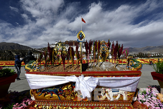 圖為布達(dá)拉宮廣場(chǎng)上擺放的切瑪盒。