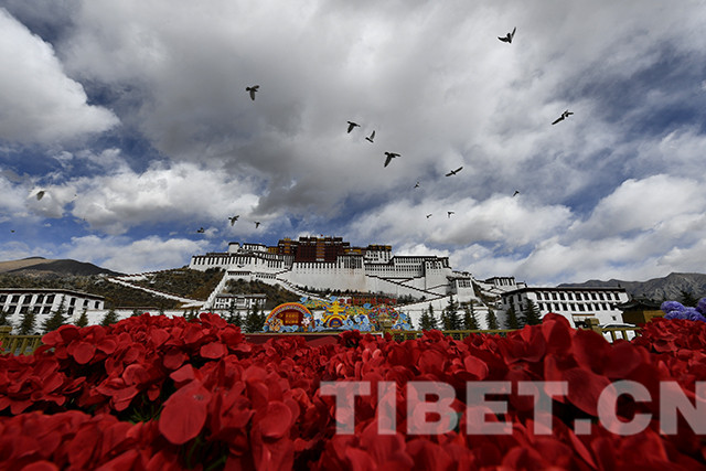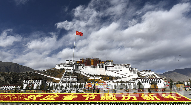 拉薩市園林局負(fù)責(zé)人介紹,3000多盆仿真花卉和4萬余束紅黃兩色的絹花用在布達(dá)拉宮廣場(chǎng)中心位置進(jìn)行地面裝飾,營造春節(jié)、藏歷新年的濃厚氛圍。