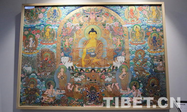 展覽共展出中國(guó)工藝美術(shù)大師、國(guó)家非物質(zhì)文化遺產(chǎn)項(xiàng)目代表性傳承人娘本、以及其弟子參與創(chuàng)作的唐卡作品25幅。圖為娘本唐卡作品《釋迦摩尼佛》。攝影:楊月云