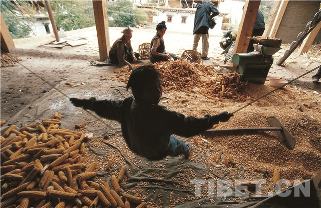 十月的鹽井正是收獲的季節(jié),金燦燦的玉米和圓潤(rùn)飽滿的核桃鋪滿了每家每戶的房頂,樹上的水果吃不及,石榴、蘋果和梨掉了一地,路邊的小孩人手一支彈弓——用來打樹上的果子吃。動(dòng)作慢的人家還在地里收割玉米、搶先一步的人家已經(jīng)在將曬干的玉米放進(jìn)脫粒機(jī)了,而運(yùn)核桃的汽車、馬幫則已經(jīng)上路。農(nóng)忙中的鹽井一派熱鬧歡騰景象。