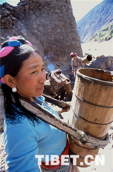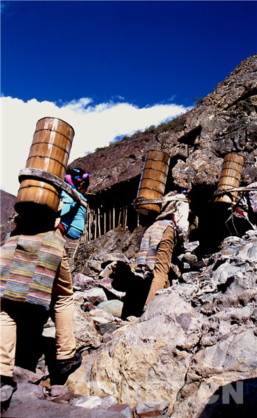 鹽田里的事自古就是由女人操持的,按她們的解釋是因?yàn)槟腥舜中?,?huì)弄臟了白花花的鹽,賣(mài)不出好價(jià)去。所以男人就負(fù)責(zé)運(yùn)輸和銷(xiāo)售工作,他們會(huì)在女人已經(jīng)曬出小山樣的一堆鹽巴時(shí),趕著騾馬來(lái)把鹽馱走,然后跋山涉水到巴塘、德欽、昌都一帶,換錢(qián)糧或者茶葉。而女人就用自己的雙肩背起水桶,下到陡峭的江邊汲水,再沿著細(xì)小的棧道背到用木支架撐起的鹽田里,等無(wú)數(shù)桶鹵水將鹽田灌滿(mǎn)后,剩下的就是盼著陽(yáng)光和風(fēng)快快將水分蒸干,第二天就可以收獲了。她們就這樣日復(fù)一日年復(fù)一年地將狹窄的山路踩踏了千萬(wàn)遍。