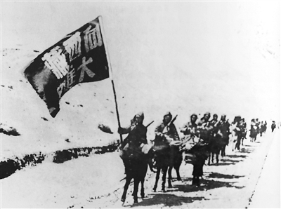 次日,當東方剛剛發(fā)白,先遣隊便開始了攀登大冰山的戰(zhàn)斗。冰山上空氣稀薄,坡陡無路,騎隊攀登艱難。戰(zhàn)士們的胸口悶得發(fā)慌,心臟好像要從嘴里跳出來,頭痛得好似腦袋要開裂,馬也張著嘴喘著粗氣。有的戰(zhàn)士用手絹把頭緊緊綁住,有的拉著馬尾前進,有的倚著馬堅持邁步。高原反應(yīng)嚴重者,幾乎昏迷過去,體質(zhì)較強的同志攙扶著體弱的。戰(zhàn)士們難受得既不能吃,也不想喝,一百多人四頓飯只吃了八十來斤糧食。