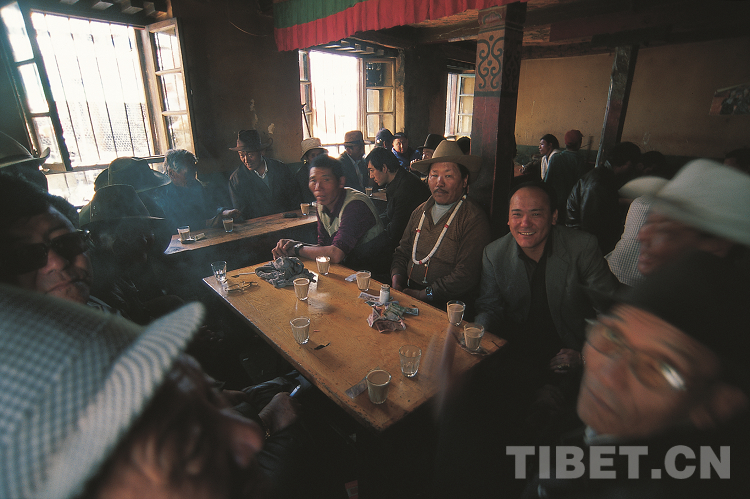 近幾十年,拉薩又興起飲一種由印度傳來的“甜茶”,原料是來自印度或我國云南的紅茶,加鮮奶和糖煮成,味道甜爽滑膩。不管是老年人還是年輕人,大家都喜歡聚在甜茶館里,因?yàn)槟抢锊粌H可以喝茶,還是一個(gè)聊天交流的場所。那也是我的最愛,光明甜茶館、革命甜茶館都是我常去的地方。走累了就隨便走進(jìn)一家路邊的茶館,先和身旁的人點(diǎn)頭笑笑,然后在他們身邊擠著坐下,一把零錢往桌子上一放,送茶員就會(huì)拎著茶桶和小玻璃杯過來,給你倒上一杯茶,然后數(shù)走茶錢。如果你沒有零錢,送茶員會(huì)自行找好零錢放回你面前的桌上。雖然聽不懂藏語,但我很享受這種地道的氛圍,于是常常在甜茶館里待著。