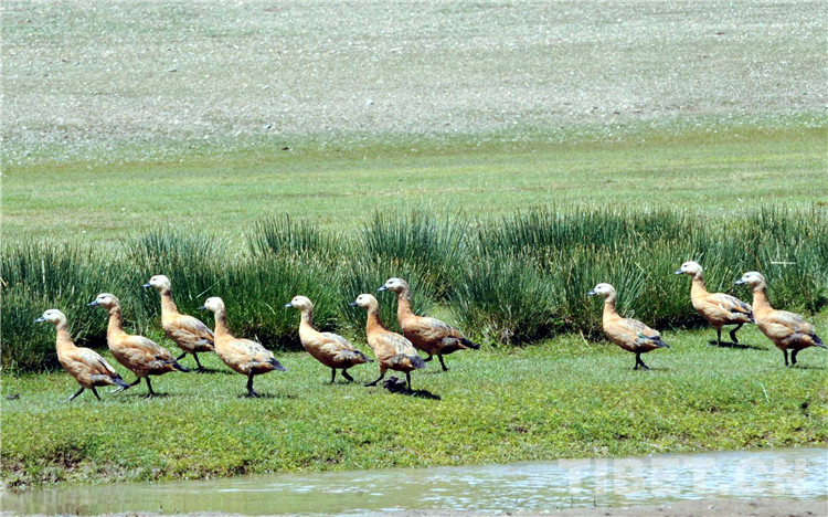 這是國家二級保護(hù)動物赤麻鴨(黃鴨)在申扎草原河邊“漫步”。(唐召明2009年8月9日攝)