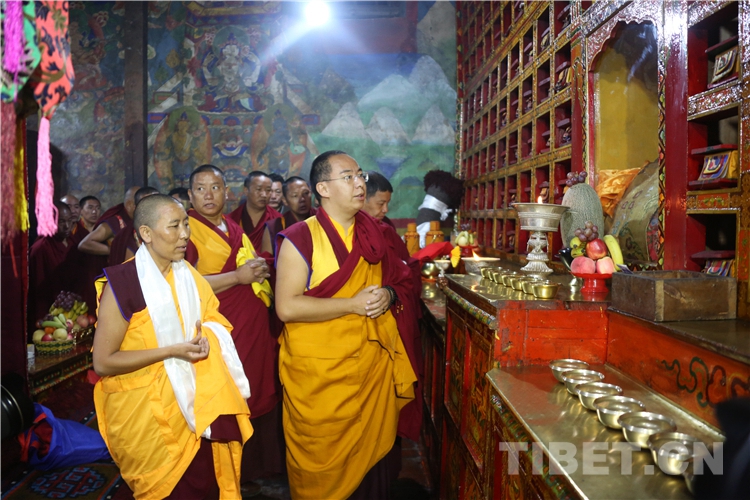 伴隨著裊裊桑煙、陣陣佛樂,十一世班禪緩步走進帕巴寺主殿禮佛,并登上主殿寶座。帕巴寺僧尼為十一世班禪敬獻曼扎。稍后,十一世班禪帶領僧尼誦經(jīng)祈福,并為從四面八方趕來、早已在此等候的信教群眾摸頂賜福。