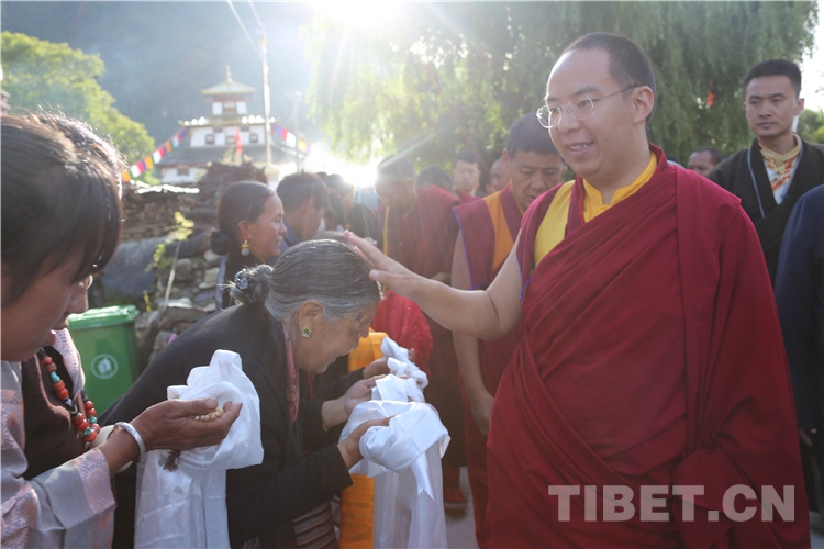 十一世班禪抵達強真寺,前往主殿朝拜禮佛,并帶領眾僧集體誦經(jīng)祈福。隨后,在寺廟正門為遠道而來的信教群眾摸頂賜福。信教群眾得到了十一世班禪的摸頂賜福并領到了長壽金剛結(jié)和十一世班禪像,十分幸福和開心,自發(fā)唱起了當?shù)氐膫鹘y(tǒng)歌曲,歌聲悠長,充滿吉祥。