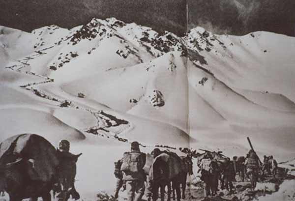圖為進(jìn)藏部隊(duì)過冰河、翻雪山,奮勇前進(jìn)。翻拍:李元梅