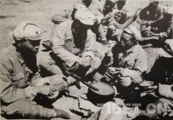 圖為官兵們依靠代食粉充饑。圖片來源:紀(jì)錄片《口述西藏》