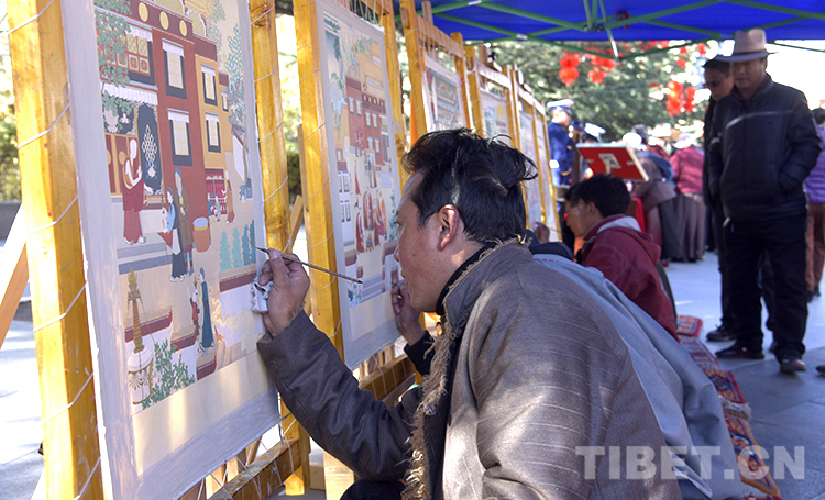 圖為唐卡畫師現(xiàn)場繪制寺廟消防安全唐卡 攝影:王媛媛