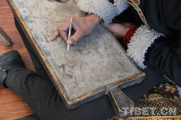 圖為桑昂然珠在木板上練習(xí)繪畫技法。這種木板上面先涂上墨水,再涂一層牛油,最后涂上牛糞燒成的灰,用削尖的木棍繪畫,畫過(guò)的痕跡可以擦掉反復(fù)使用 攝影:李元梅