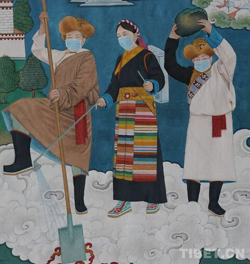 中國西藏網(wǎng)訊 一幅60cm*45cm的畫布上,一位身著藏族服飾的阿佳正戴著口罩噴灑消毒液。這并不是普通的繪畫作品,而是西藏唐卡畫師旦巴云丹耗時一個多月繪制的戰(zhàn)“疫”主題唐卡。