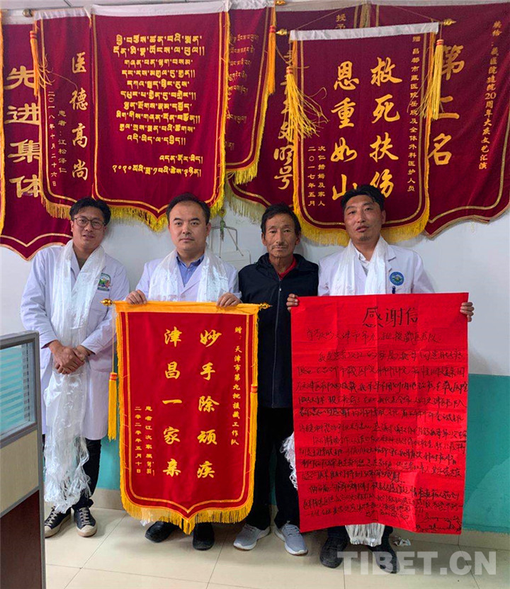 圖為患者(右二)向第九批援藏醫(yī)療工作隊贈送錦旗和感謝信