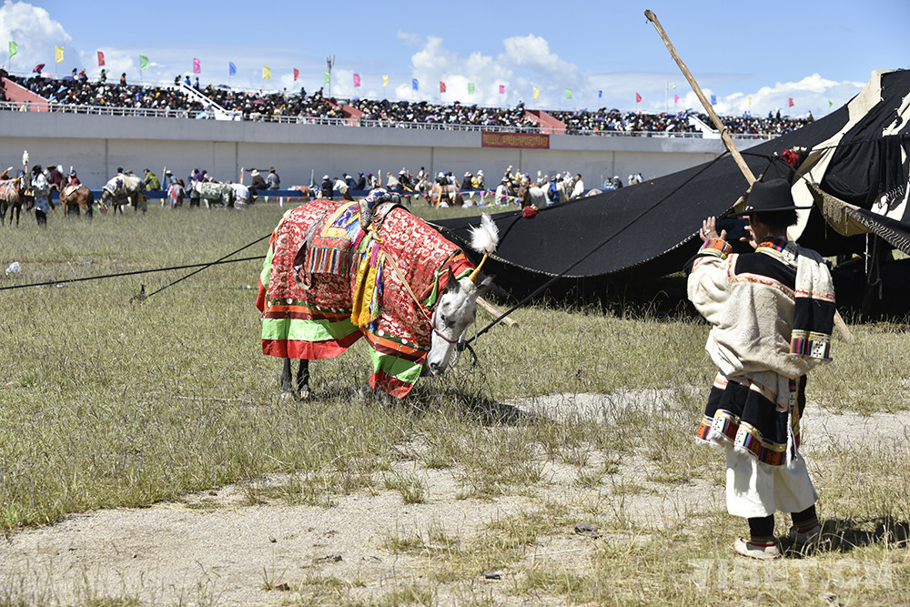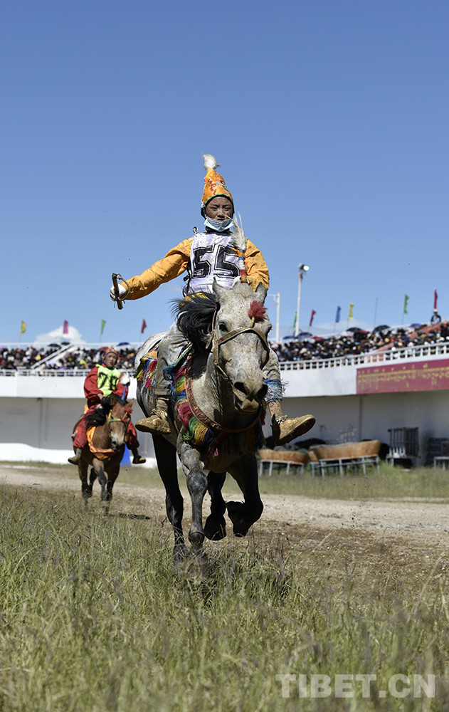 8月12日上午,西藏自治區(qū)那曲市2020羌塘恰青格薩爾賽馬藝術(shù)節(jié)的重頭戲——場(chǎng)內(nèi)速度賽馬比賽開始。賽道內(nèi),沙塵飛濺;看臺(tái)上,座無虛席,吶喊助威。