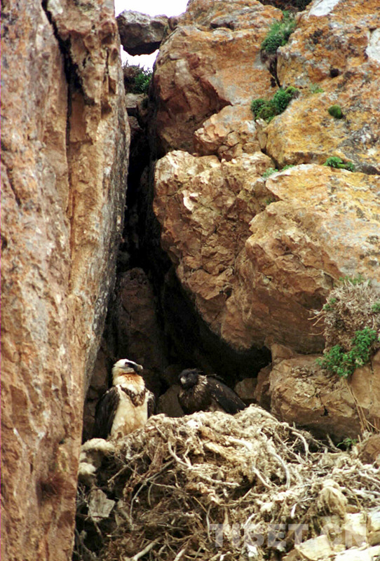 科考人員在科考中發(fā)現(xiàn),在扎西多半島西北角突兀懸崖峭壁上有一個(gè)很大的胡兀鷲雜草屋,只見(jiàn)雌鳥(niǎo)飛出飛進(jìn),在給4個(gè)月大小的雛鳥(niǎo)喂食。這種頭頂和后頸為白色、頭頂周?chē)幸蝗谟穑L(zhǎng)有胡須、腹部為褐色的胡兀鷲,體長(zhǎng)1米多。