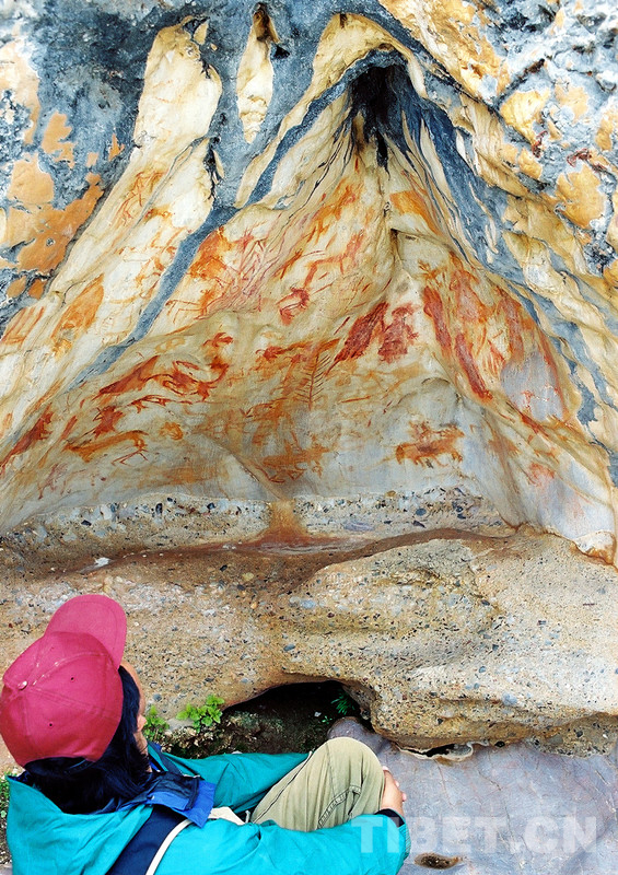 這是科考人員在考察納木錯(cuò)扎西多半島溶洞巖畫(huà)(唐召明2001年攝)