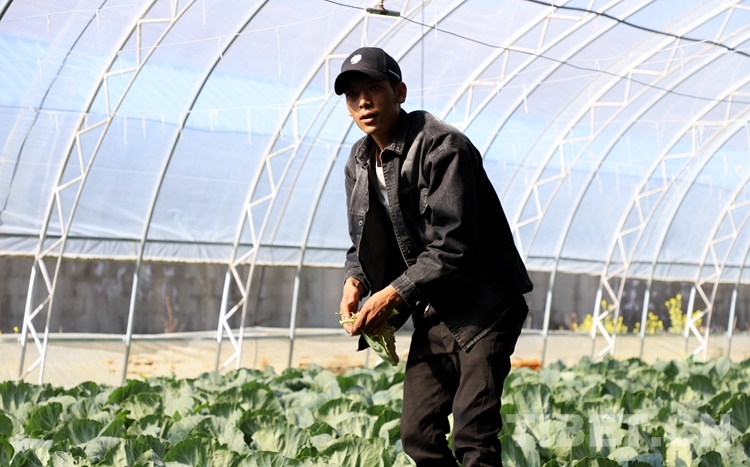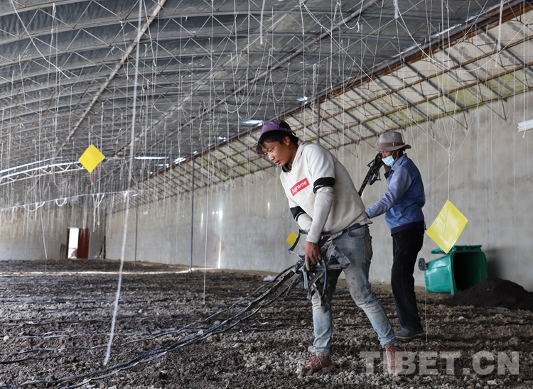 圖為扎西(左一)在大棚內(nèi)干活,準備種植蓮花白