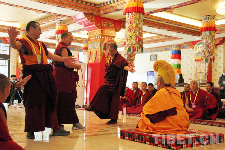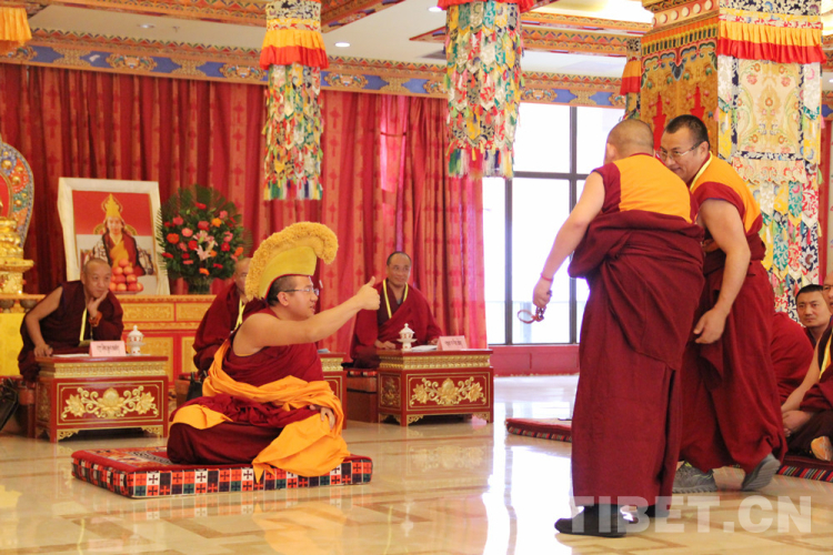 被主考官點(diǎn)名上場的考僧,身披黃色法衣,結(jié)跏趺坐于考場正中佛墊,屏氣凝神。提問辯經(jīng)人員用“諦……”聲提示“舌戰(zhàn)”開始,并在考場上來回走動(dòng)間口若懸河、滔滔不絕,即興向考僧提問。提問過程中,辯經(jīng)人員常會(huì)借助各種手勢來增強(qiáng)辯論的力度。如右手甩念珠,快速跨步向前,高舉右手,用力擊掌,聲如裂石,令人振奮。考僧必須集中精力,意志堅(jiān)定,沉著應(yīng)戰(zhàn)。不得不說,雙方常會(huì)言辭激烈,爭辯得面紅耳赤,這種情況下,仍能夠從容不迫、應(yīng)答得體的佼佼者才能得到認(rèn)可,脫穎而出。