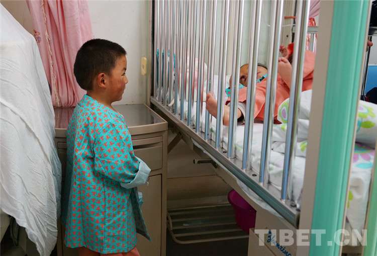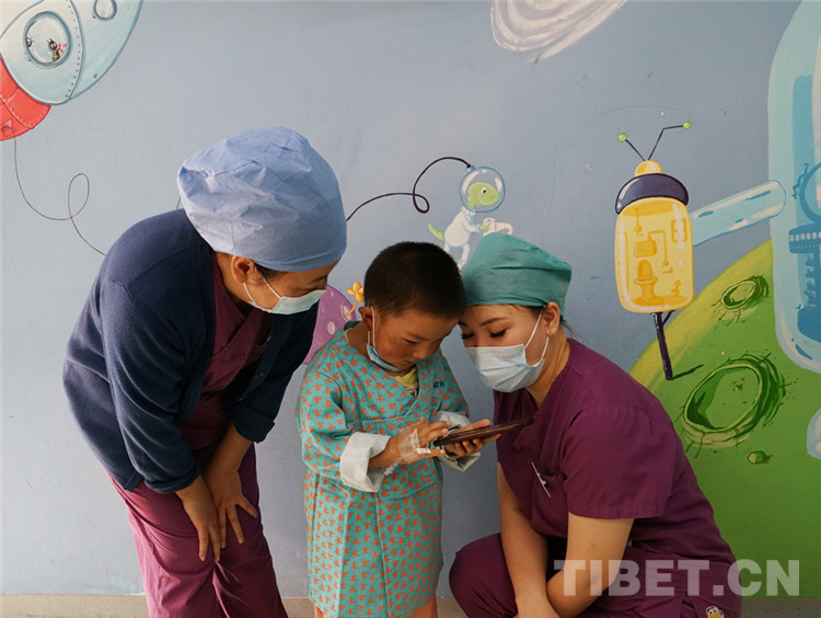 在記者采訪過程中,呷瑪龍刀尼瑪閑不住地跑來(lái)跑去,一會(huì)兒跑去看病友妹妹呷絨拉姆有沒有乖乖睡覺,一會(huì)兒又拿起舅舅的手機(jī)刷小視頻,還熱情地分享給護(hù)士看。