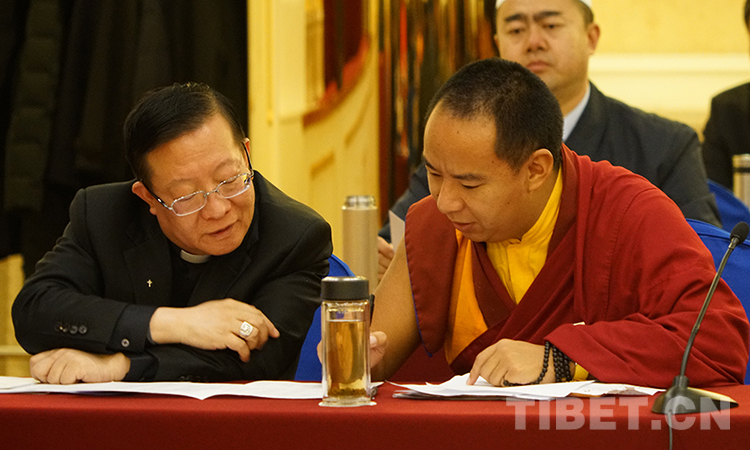 圖為2018年全國兩會期間,十一世班禪參加小組會時(shí)與中國天主教主教團(tuán)主席馬英林討論 攝影:宋家麗