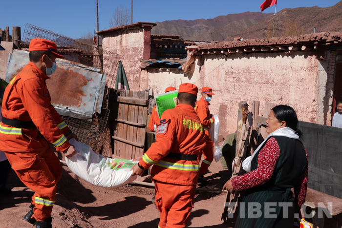 圖為卡若區(qū)森林消防中隊指戰(zhàn)員抬著慰問品送到困難群眾家中