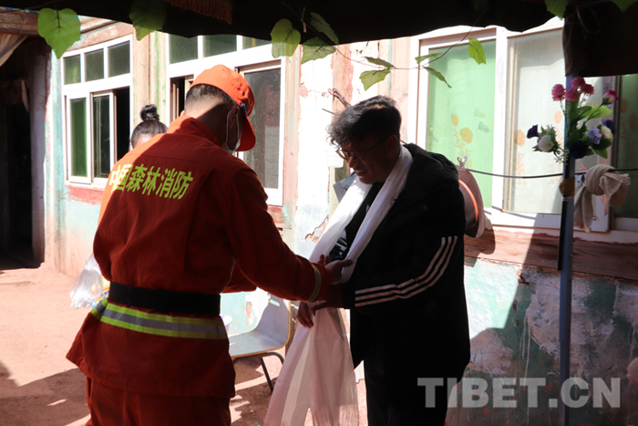 圖為卡若區(qū)森林消防中隊指戰(zhàn)員為群眾獻上哈達