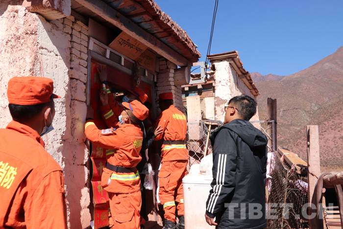 圖為卡若區(qū)森林消防中隊指戰(zhàn)員為困難群眾家里貼上春聯(lián)
