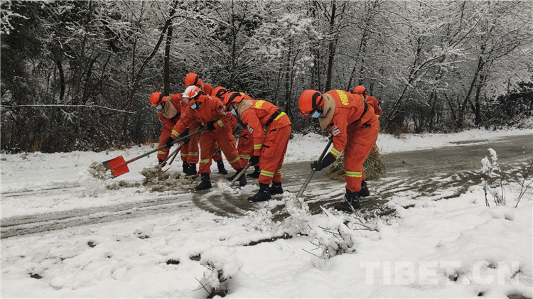 圖為消防員們正在清理道路積雪,為過(guò)往車輛保駕護(hù)航