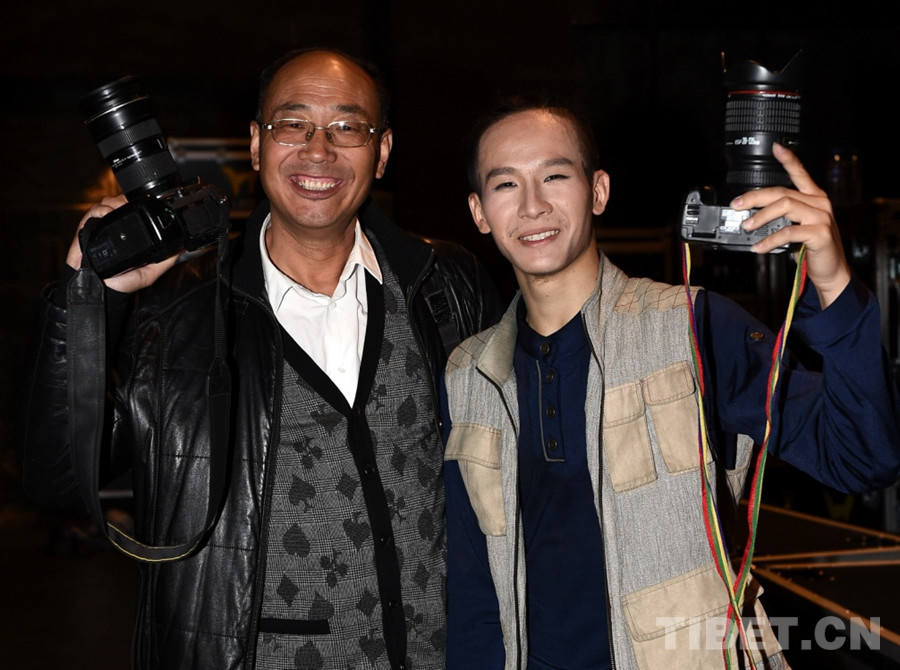 圖為唐召明(左)與《圓夢》歌舞劇策劃人朱強(右)在電力大學劇場演出結束后合影留念(唐召明2015年9月28日攝)