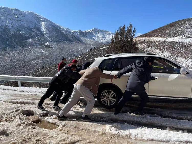 面對焦急萬分的父親,為了讓病中的孩子第一時(shí)間得到醫(yī)治,根秋降澤立即下車施救。由于鄉(xiāng)村道路路況較差,加之冰雪覆蓋,車輛打滑嚴(yán)重,施救過程十分艱難。根秋降澤憑借多年應(yīng)對冰雪路況的駕駛經(jīng)驗(yàn),組織大家在極度嚴(yán)寒、工具缺乏的情況下,通過刨冰除雪、手推車?yán)姆绞?,?jīng)過半個(gè)多小時(shí)的努力終于讓被困車輛擺脫困境。根秋降澤捂著凍僵的手,一再提醒駕駛員要常備防滑鏈條,在冰雪路段需小心謹(jǐn)慎駕駛,切勿急打方向等注意事項(xiàng)。