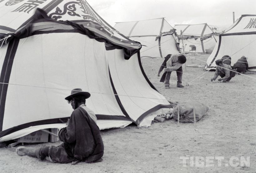圖為在文部辦事處(現(xiàn)改為尼瑪縣)的布藏河畔舉行賽馬會前,城鎮(zhèn)人家正在搭建各自的帳篷(唐召明1987年攝)