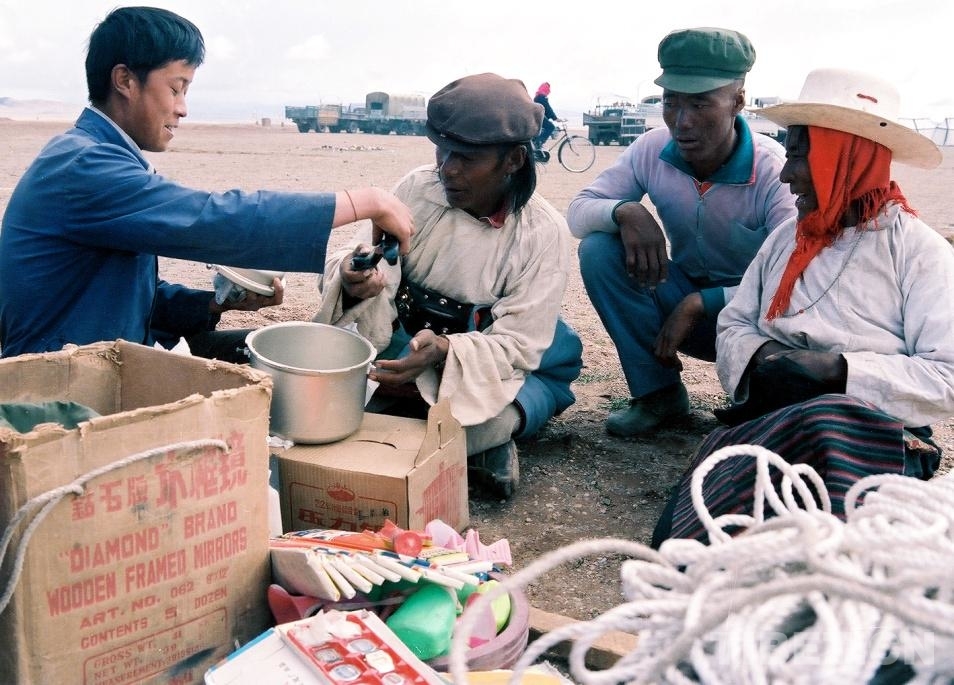 圖為在文部辦事處(現(xiàn)改為尼瑪縣)賽馬會上,如“候鳥”一樣飛來飛去的漢族商販在經(jīng)營小商品(唐召明1987年攝)