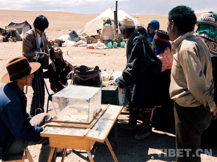 圖為在文部辦事處(現(xiàn)改為尼瑪縣)賽馬會上,“候鳥”型的漢族商販在擺攤鑲牙和修表(唐召明1987年攝)